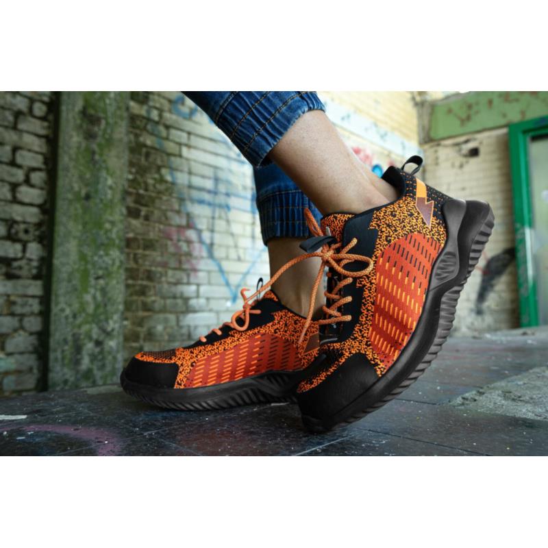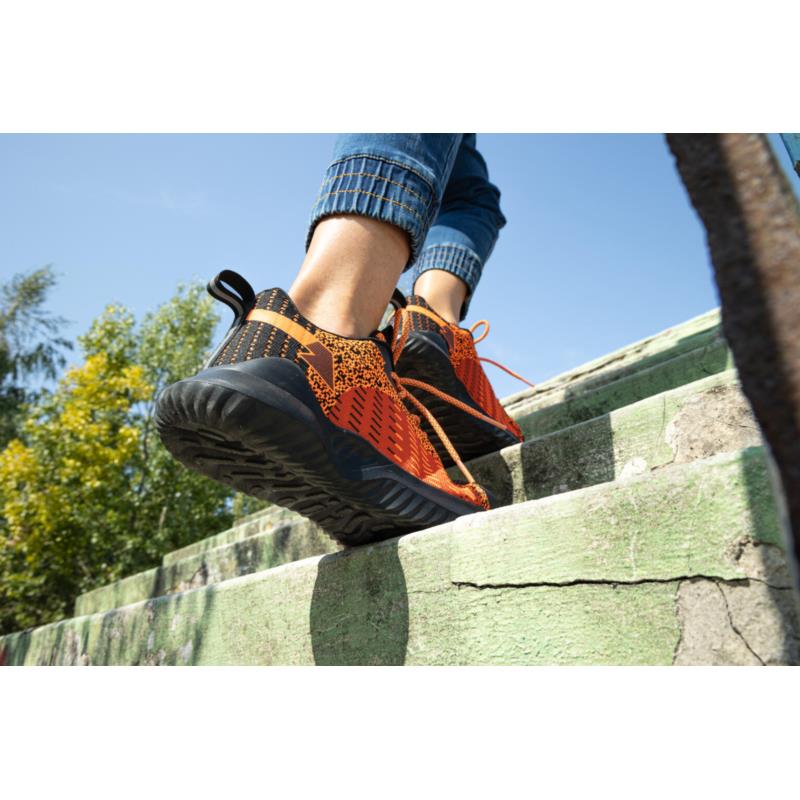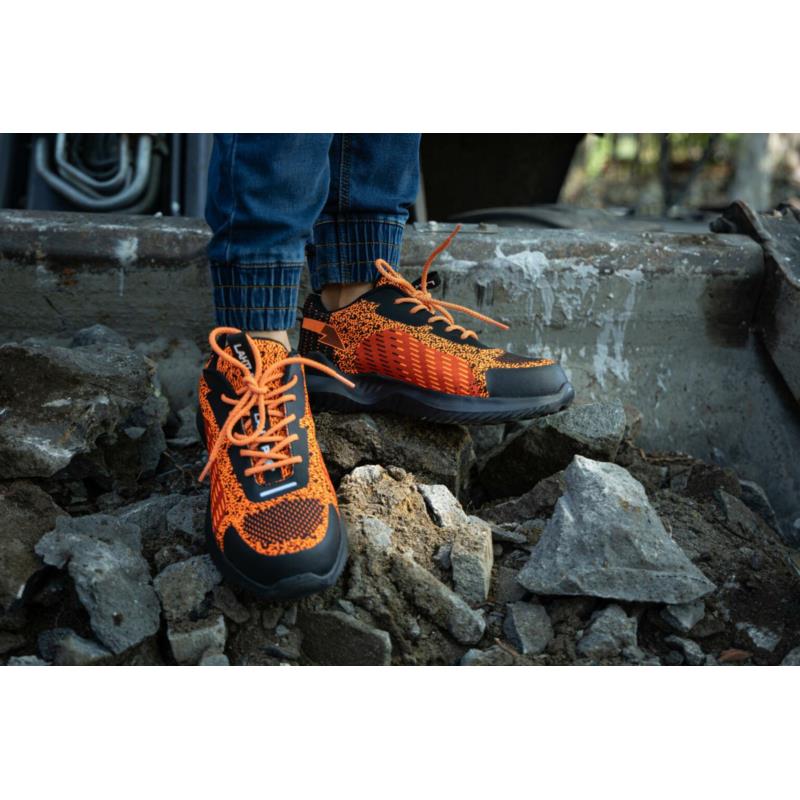 Półbuty robocze Lahti Pro L30441 w kolorze pomarańczowo-czarnym to idealne połączenie komfortu i trwałości. Wykonane z siatkowej dzianiny, zapewniają doskonałą wentylację, a elastyczne tworzywo KPU wzmacnia ochronę przed uszkodzeniami. Stalowy podnosek zgodny z normą EN ISO 20345:2022 oraz odblaskowe elementy zwiększają bezpieczeństwo. Podeszwa EVA, odporna na olej, czyni je idealnym wyborem dla pracowników w trudnych warunkach.