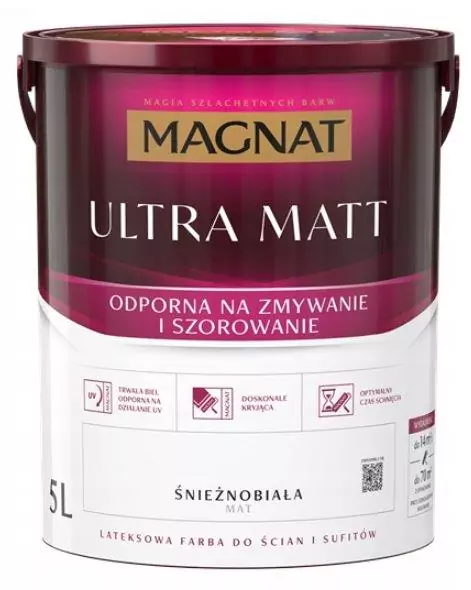 Farba Ceramiczna Magnat Ceramic Ultra Matt Biała 5L to produkt o ultra matowym wykończeniu, idealny do malowania wnętrz mieszkalnych i użyteczności publicznej. Zapewnia głęboki, matowy kolor oraz wysoką odporność na ścieranie i zmywanie. Dzięki technologii Ceramicznej cechuje się wyjątkową trwałością powłoki malarskiej. Doskonale kryje, łatwo się aplikuje i jest ekologiczna, minimalizując ryzyko alergii. Paroprzepuszczalna formuła zapewnia łatwą pielęgnację.