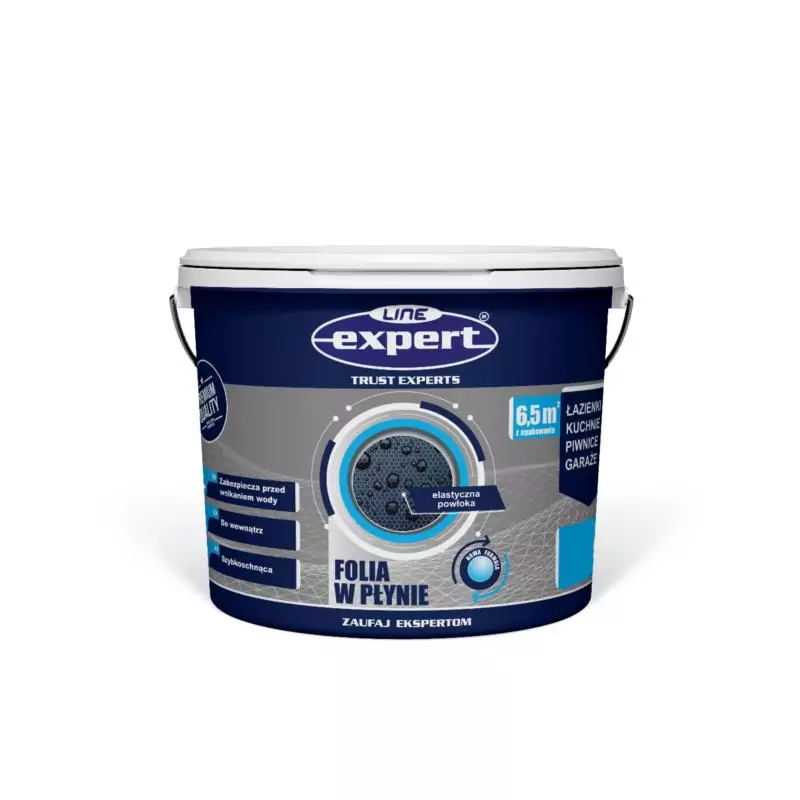 Folia w płynie Expert Line to zaawansowany materiał hydroizolacyjny idealny do łazienek, kuchni, pralni, balkonów i tarasów. Produkt jest elastyczny, wodoodporny oraz odporny na mróz i promieniowanie UV. Aplikowany pędzlem, wałkiem lub natryskiem, zapewnia doskonałą przyczepność do betonu, jastrychu i tynków cementowo-wapiennych. Szybkoschnąca formuła umożliwia nałożenie drugiej warstwy po 2 godzinach.