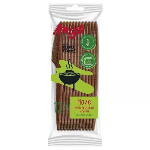Noże wielokrotnego użytku Amigo (12 szt.) to ekologiczne i trwałe sztućce wykonane z innowacyjnego kompozytu WPC, łączącego polimer z naturalnym włóknem drzewnym. Redukują zawartość plastiku o 40–50%, są odporne na temperaturę do 95°C i wytrzymują do 125 cykli mycia w zmywarce. Idealne na grilla, piknik czy do codziennego użytku.