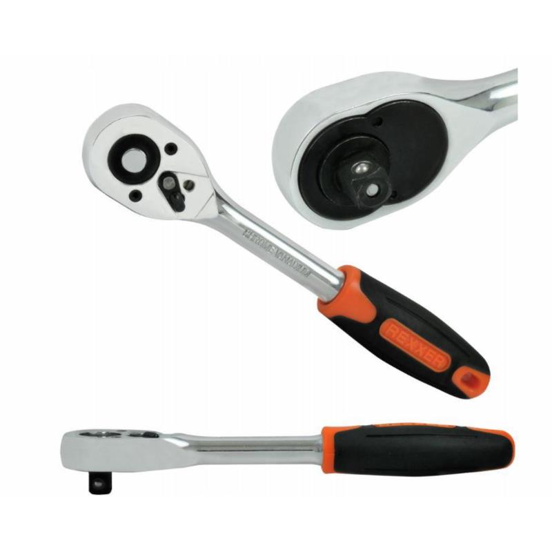 Grzechotka odgięta 1/2" 72 zęby Rexxer RA-05-022 to profesjonalny klucz grzechotkowy, zaprojektowany do efektywnej pracy z nasadkami w zastosowaniach warsztatowych i serwisowych. Dzięki precyzyjnemu mechanizmowi z 72 zębami oraz wykonaniu z wytrzymałej stali CrV, narzędzie zapewnia wysoki moment obrotowy i długą żywotność.