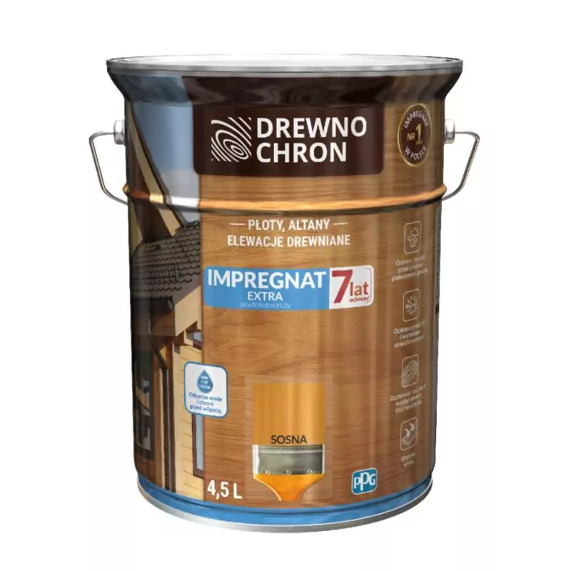 Impregnat Extra Sosna 4,5L Drewnochron to powłokotwórczy impregnat do drewna, idealny do ochrony i dekoracji elementów drewnianych na zewnątrz. Zapewnia ochronę przed wilgocią, grzybami, pleśnią i promieniami UV, tworząc trwałą powłokę zabezpieczającą. Produkt podkreśla naturalną strukturę drewna, nadając mu estetyczny wygląd. Łatwy w aplikacji i szybko schnie, zapewniając skuteczną ochronę drewna przez długi czas.