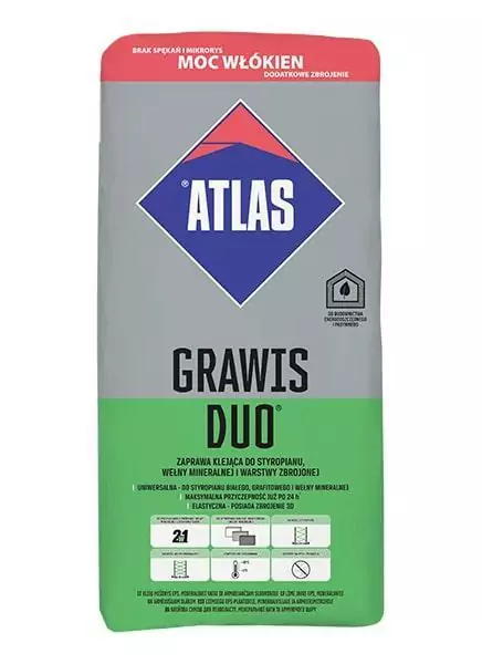 ATLAS GRAWIS DUO wyróżnia się zbrojeniem 3D, które efektywnie mostkuje rysy oraz minimalizuje ich powstawanie, zwłaszcza w strefach połączeń między styropianem a wełną mineralną. Produkt ten umożliwia także przyklejanie płyt termoizolacyjnych, zarówno EPS do 50 cm, jak i wełny mineralnej do 30 cm. Dodatkowo służy do wykonywania warstwy zbrojonej, co podnosi efektywność termiczną budynków. Powierzchnia zużycia zależy od stopnia równości podłoża, a jednostkowe zużycie wynosi od 3,0 do 6,0 kg/m², w zależności od zastosowania.