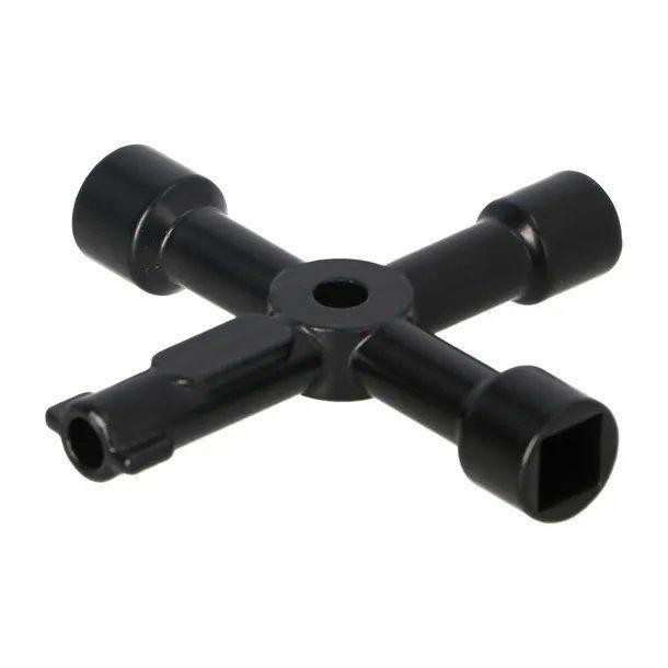 Klucz Faster Tools wyróżnia się kompaktową budową o szerokości 72 mm oraz czterema zintegrowanymi końcówkami, które odpowiadają na pytanie, jaki klucz do szafek gazomierzy czy liczników prądu wybrać. W skład zestawu wchodzą: dwie końcówki kwadratowe (8x8 mm oraz 6x6 mm), jedna końcówka trójkątna (8 mm) oraz specjalistyczna końcówka okrągła ze skrzydełkami (średnica wewnętrzna 5 mm). Taki klucz serwisowy z czterema końcówkami pasuje do wielu typów zamków, eliminując potrzebę posiadania wielu oddzielnych kluczy specjalistycznych.