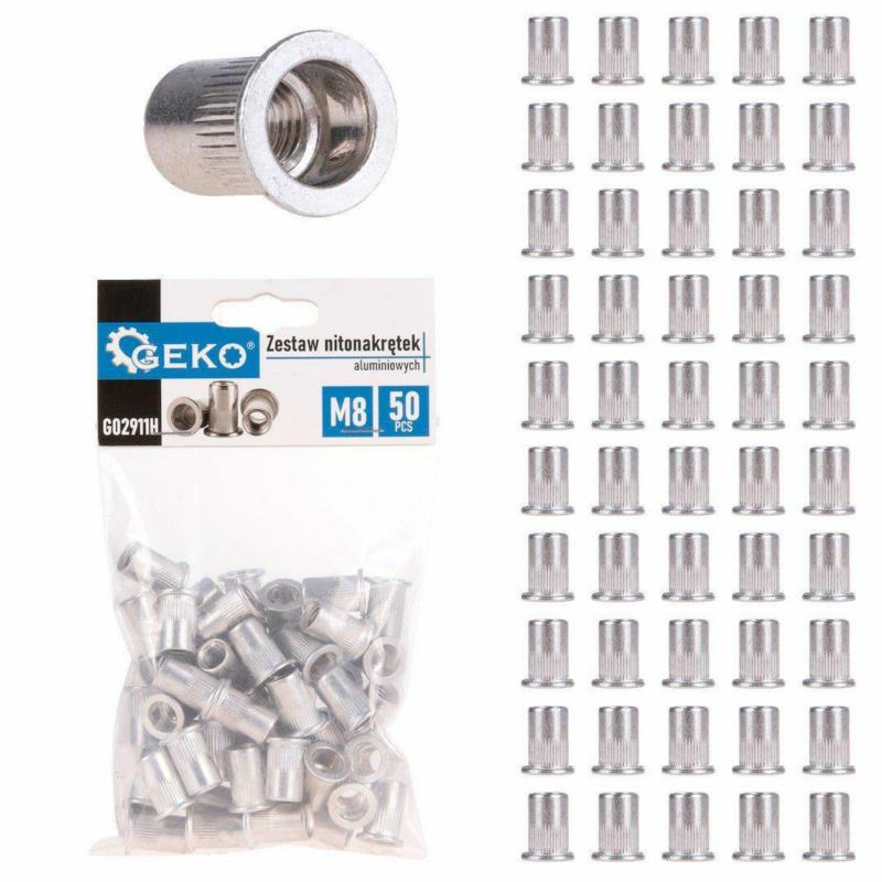 Zestaw nitonakrętek aluminiowych M6 Geko G02911F to kompletny pakiet 50 sztuk wysokiej jakości elementów złącznych, niezbędnych w nowoczesnej technice łączenia. Te nitonakrętki M6 pozwalają na szybkie i proste stworzenie trwałego gwintu metrycznego w materiałach, w których nie ma możliwości wykonania go tradycyjnymi metodami. Są idealnym rozwiązaniem, gdy potrzebujemy zamocować śruby M6 w miejscach o ograniczonym dostępie, np. w profilach zamkniętych.