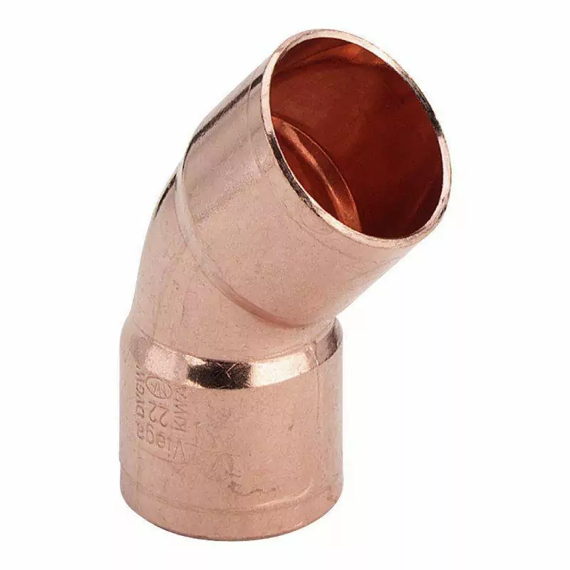 Łuk 45° Viega dwukielichowy 28 mm to miedziana kształtka instalacyjna do lutowania kapilarnego, stworzona do prowadzenia rur pod kątem 45° w instalacjach wodnych, grzewczych i sanitarnych. Dzięki dwukielichowej konstrukcji zapewnia szybki montaż oraz szczelne, trwałe połączenia rur o średnicy 28 mm. Wysokiej jakości miedź zwiększa odporność na korozję i długą żywotność systemu, co gwarantuje niezawodność działania całej instalacji.