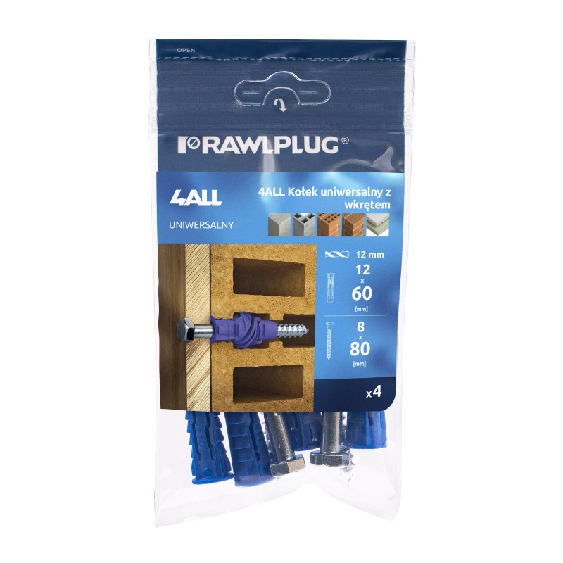 Kołek uniwersalny 4ALL Rawlplug R-S3-4ALL-12/80/4 12x60 mm z wkrętem HEX 8,0x80 mm – 4 szt.