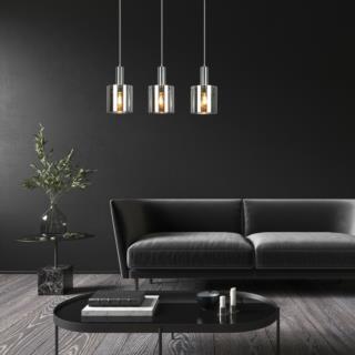 Lampa wisząca Rabalux Donati 5250 to eleganckie oświetlenie w stylu nowoczesnym, wykonane z metalu i dymionego szkła w chromowanym wykończeniu. Wyposażona w trzy oprawki E27 (maks. 60W każda), idealnie sprawdzi się w salonie, jadalni czy kuchni. Wymiary: szerokość 60 cm, wysokość do 120 cm.