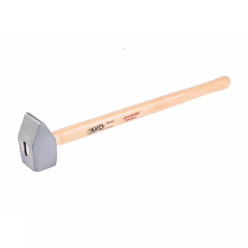Głowica młotka o masie 10000g (10 kg) została kuta na gorąco z wysokowęglowej stali C45, co zapewnia jej wyjątkową gęstość i odporność na pękanie. Kluczową cechą jest strefowe hartowanie na końcach, które gwarantuje twardość obucha i rąba, jednocześnie zachowując elastyczność w pozostałej części głowicy. Powierzchnia została precyzyjnie szlifowana i pokryta specjalnym preparatem, tworzącym twardą warstwę odporną na korozję. Całość osadzona jest na solidnym, profilowanym trzonku drewnianym, który skutecznie tłumi drgania i zapewnia pewny chwyt podczas pracy.