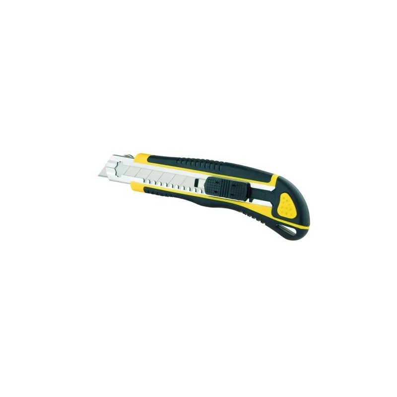 Ten wyjątkowy nożyk techniczny wyróżnia się solidną konstrukcją, której podstawą jest obudowa z tworzywa sztucznego pokrytego gumą, zapewniająca pewny chwyt i redukująca ryzyko wyślizgnięcia się narzędzia. Metalowa prowadnica gwarantuje stabilność i precyzję prowadzenia ostrza o szerokości 18 mm, co jest kluczowe dla równego cięcia. Kluczową zaletą jest mechanizm automatycznej wymiany ostrza, który znacząco przyspiesza pracę i zwiększa bezpieczeństwo, eliminując potrzebę ręcznego przeładowywania. Dodatkowo, nóż z blokadą ostrza zatrzaskową pozwala na bezpieczne zablokowanie ostrza w wybranej pozycji, co jest niezbędne podczas wymagających cięć w twardszych materiałach.