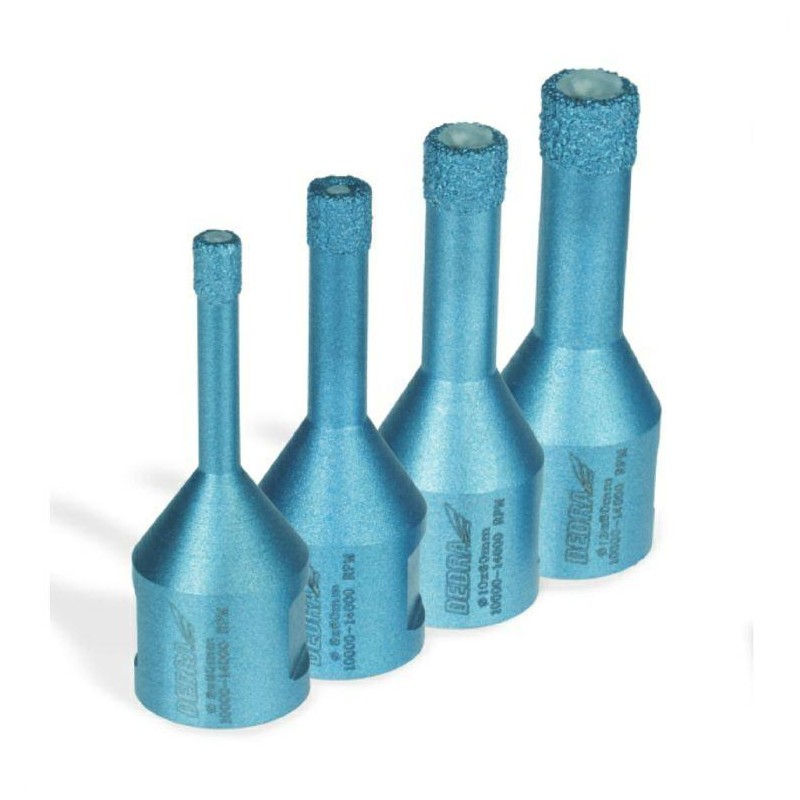 Zestaw czterech koronek diamentowych marki DEDRA (model DED1590SZ02) zawiera średnice 6, 8, 10 i 12 mm oraz mocowanie gwintowe M14. Koronki wykonane w technologii vacuum brazed, pozbawione lutowania czy spawania laserowego segmentów, co zapobiega ich oderwaniu podczas pracy. Idealne do wiercenia na sucho i mokro w betonie, cegle, szkle, asfalcie, laminatach, PCV, stali i drewnie. Długość korony 60 mm, zalecana prędkość obrotowa 10 000-14 000 obr./min.