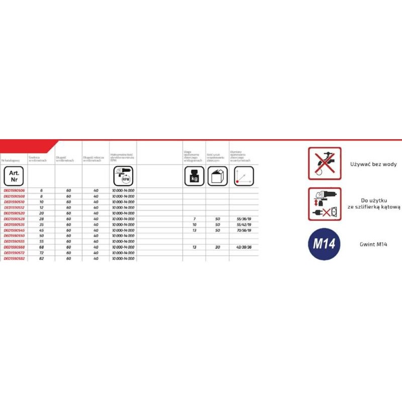 Dedra DED1590S12 to najwyższej jakości koronka diamentowa-otwornica ?12 mm z mocowaniem M14, wykonana w technologii vacuum brazed. Idealna do profesjonalnych zastosowań — nadaje się do betonu, cegły, ceramiki, szkła, metalu oraz tworzyw sztucznych. Dzięki nasypowi diamentowemu zapewnia długą żywotność i precyzyjne wiercenie. Świetny wybór dla wykonawców i majsterkowiczów szukających solidnego rozwiązania.