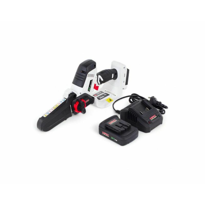 Ta mini piła łańcuchowa akumulatorowa została wyposażona w prowadnicę o długości 12,7 cm (5”) oraz wydajny akumulator litowo-jonowy 18V o pojemności 2,0 Ah, co zapewnia prędkość przesuwu łańcucha na poziomie 4,6 m/s. Niezwykle niska waga, wynosząca zaledwie 1,2 kg (bez akumulatora), w połączeniu z ergonomicznym uchwytem z antypoślizgowymi nakładkami, gwarantuje komfortową i niemęczącą pracę. Bezpieczeństwo użytkownika zwiększa wbudowany hamulec elektryczny, który natychmiast zatrzymuje łańcuch.