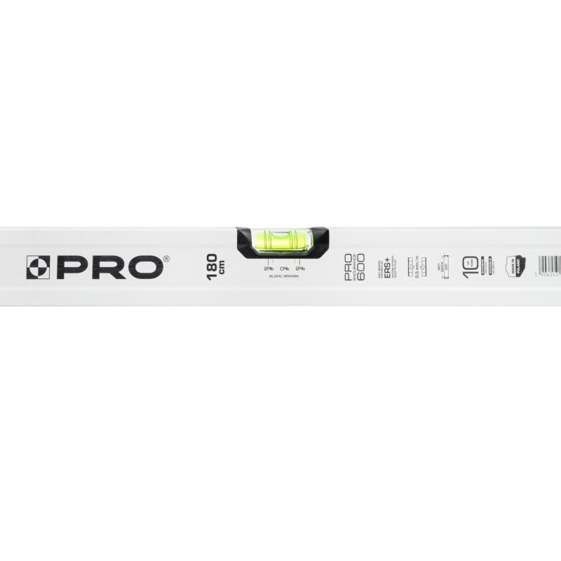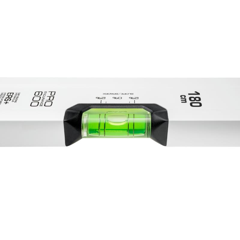 Poziomica biała 180 cm PRO600 PRO-AB180 to precyzyjne narzędzie zapewniające dokładność 0,5 mm/m oraz funkcję wyznaczania 2% spadku. Jej jednokomorowy, wzmocniony profil z elastomerowymi nasadkami ANTI SHOCK gwarantuje trwałość i komfort użytkowania. Dzięki systemowi ERS+ odczyt jest łatwy, a masywne przetłoczenia boczne zapewniają pewny chwyt. Idealna do profesjonalnych zastosowań w budownictwie.