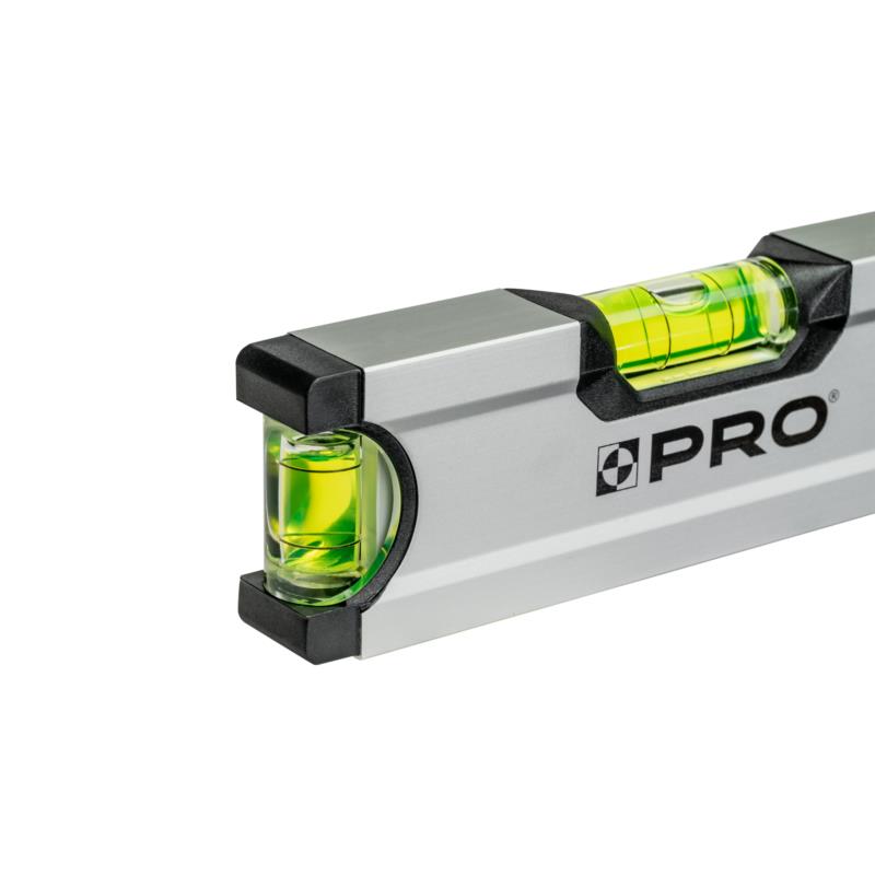 Poziomica PRO-A6017 wyróżnia się niezwykłą dokładnością pomiaru wynoszącą 0,5 mm/m oraz jedną libellą poziomu i jedną libellą pionu. Dzięki zastosowaniu masywnych przetłoczeń bocznych, zyskujesz pewny chwyt, a system ERS+ (Easy Reading System) umożliwia łatwe odczytywanie wyników. Anodowana powierzchnia zapewnia wysoką twardość na poziomie 9 w skali Mohsa. Wbudowane magnesy neodymowe zwiększają wszechstronność urządzenia, pozwalając na łatwe przyczepienie do metalowych powierzchni. Specjalnie zaprojektowane nasadki z elastomeru zapewniają ochronę przed uszkodzeniami w razie upadku (ANTI SHOCK CAP).