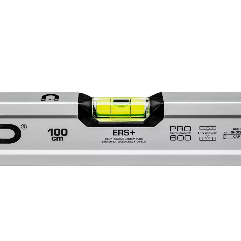 Poziomnica PRO600 anodowana srebrna 100 cm to precyzyjne narzędzie z jednokomorowym profilem, zapewniającym wysoką sztywność i twardość (9 w skali Mohsa). Wyposażona w magnesy neodymowe oraz system ERS+ dla łatwego odczytu, gwarantuje dokładność 0,5 mm/m. Jej masywne przetłoczenia boczne zapewniają pewny chwyt, a elastyczne nasadki ANTI SHOCK zabezpieczają przed uszkodzeniem. Idealna do wszelkich prac budowlanych i wykończeniowych.