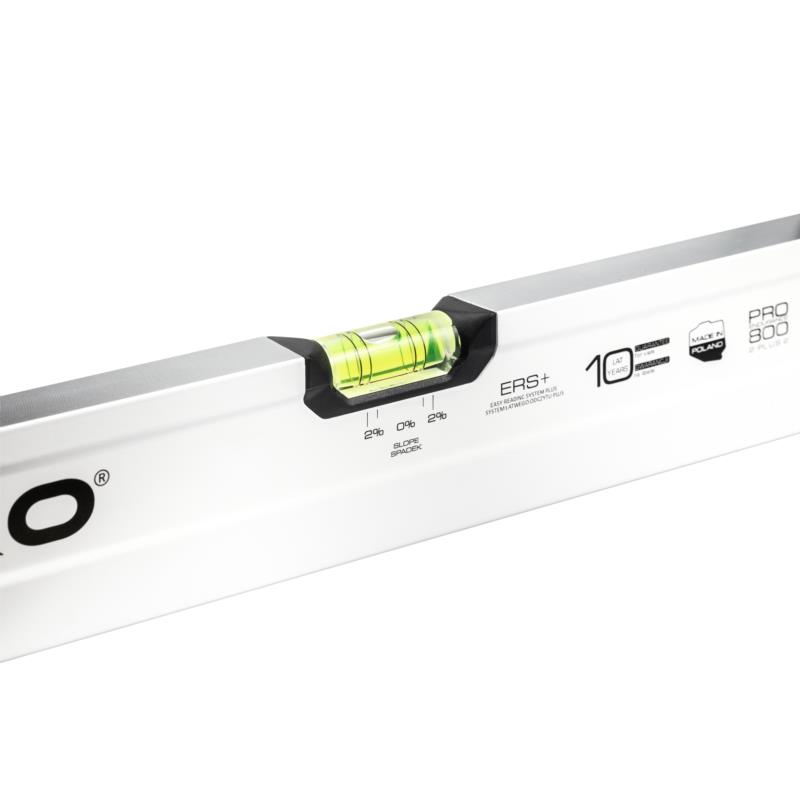 Poziomica biała PRO800 PRO-BJ120 to wzmocniony model o długości 120 cm, idealny do precyzyjnego pomiaru i oznaczania spadków 2%. Wyposażona w dwukomorowy profil o wymiarach 60 x 22 mm oraz innowacyjny system ERS+, zapewnia wyjątkową dokładność 0,5 mm/m. Dzięki ergonomicznym uchwytom i pogrubionym ściankom, poziomica jest nie tylko trwała, ale i wygodna w użytkowaniu. Wyjątkowa powierzchnia umożliwia doskonały kontakt z podłożem.