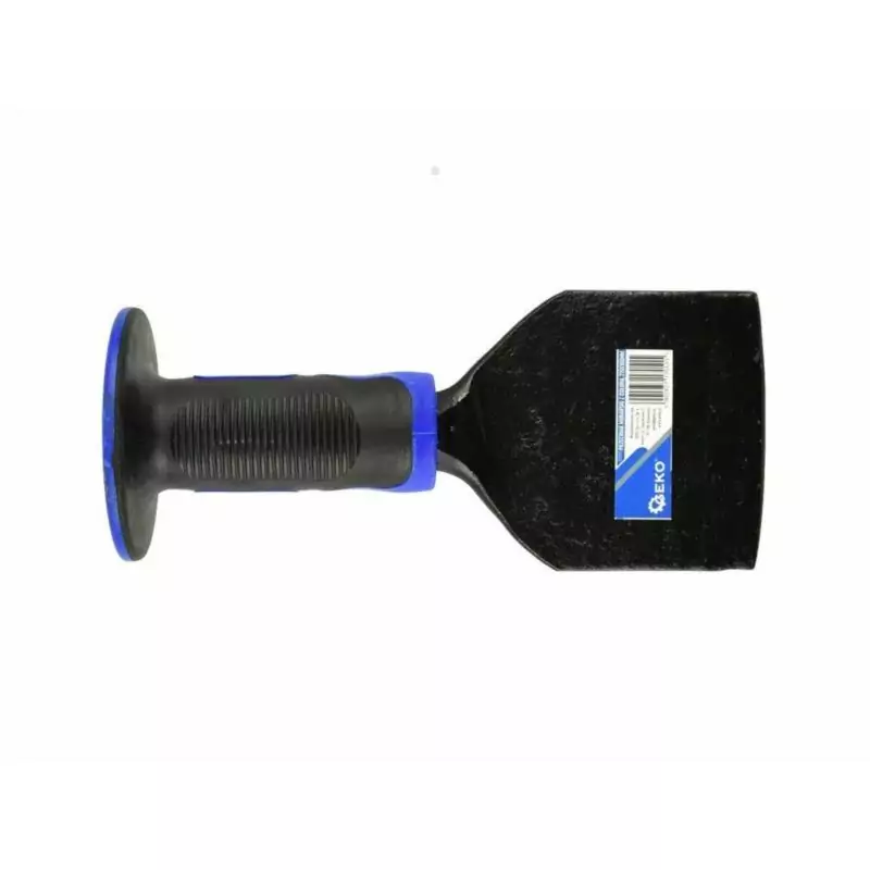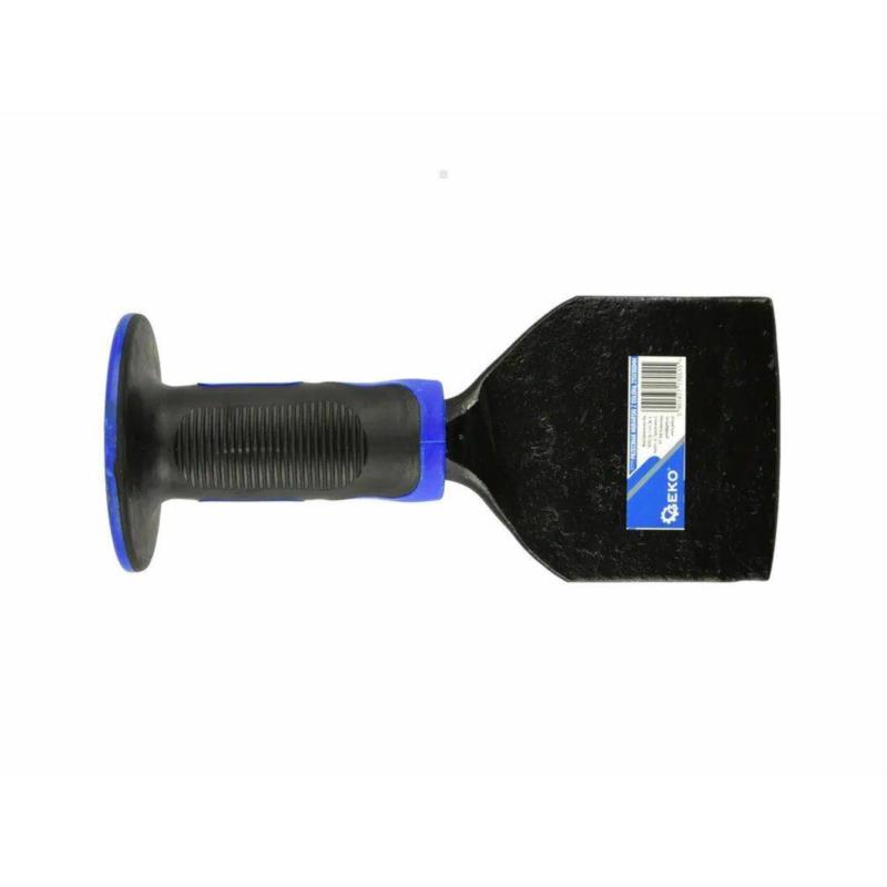 Narzędzie charakteryzuje się solidną konstrukcją, a jego wymiary 215x100 mm (długość całkowita 215 mm, szerokość ostrza 100 mm) sprawiają, że jest to uniwersalny przecinak do szerokiego spektrum zadań. Szerokie, płaskie ostrze zostało zaprojektowane do efektywnego usuwania większych fragmentów materiału, a całość wykonano z hartowanej stali, co zapewnia długą żywotność i odporność na uszkodzenia. Kluczowym elementem jest duża, gumowa osłona dłoni, która absorbuje wstrząsy i chroni rękę przed przypadkowymi uderzeniami młotka, co jest niezwykle ważne podczas intensywnego kucia betonu czy cegły.