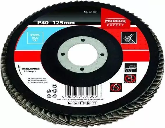 Ściernica listkowa talerzowa 125mm P100 Modeco Expert R-SLT-125-100 to profesjonalne narzędzie ścierne, zaprojektowane do wydajnego szlifowania i wykańczania różnorodnych powierzchni przy użyciu szlifierki kątowej. Jej wypukła, stożkowa konstrukcja umożliwia precyzyjną obróbkę krawędzi, spawów oraz trudno dostępnych miejsc, gwarantując doskonałe rezultaty i wysoką wydajność pracy.