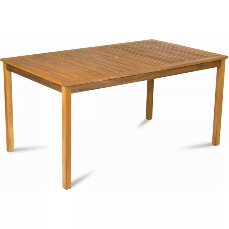 Stół ogrodowy Fieldmann o wymiarach 150x90 cm wykonany jest z trwałego drewna akacjowego, co zapewnia odporność na warunki atmosferyczne. Wyposażony w otwór na parasol, doskonale sprawdzi się w ogrodzie, na tarasie czy balkonie, oferując wygodne miejsce do spotkań na świeżym powietrzu