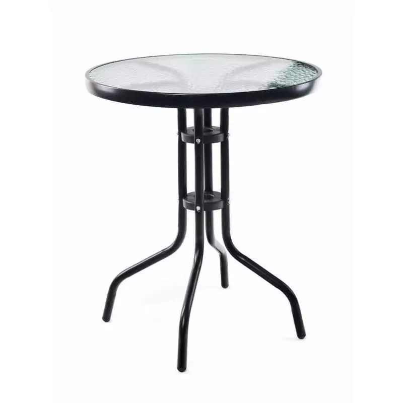 Stolik ogrodowy Happy Green 50XG4027B o średnicy 60 cm to elegancki mebel z metalową ramą i szklanym blatem, idealny na balkon, taras czy do ogrodu. Jego czarna kolorystyka i minimalistyczny design pasują do różnych aranżacji. Stolik jest odporny na warunki atmosferyczne, co zapewnia jego trwałość i łatwość w utrzymaniu czystości.