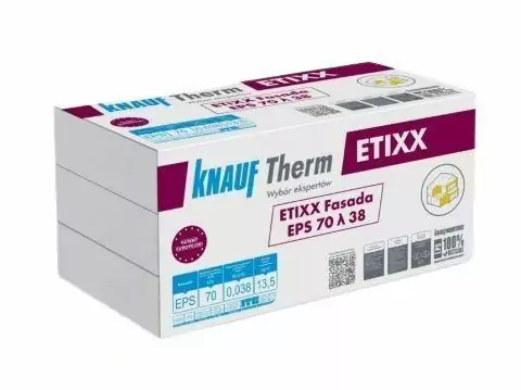 Płyty styropianowe KNAUF Therm ETIXX Fasada EPS 70 eps 038 wyróżniają się bardzo dobrymi parametrami mechanicznymi i dużą jednorodnością struktury. Dzięki procesowi produkcyjnemu osiągnięto wysoką stabilność wymiarową, co umożliwia tworzenie idealnie prosto zakończonych krawędzi. Płyty zapewniają większą izolacyjność termiczną przy mniejszej grubości, a ich twardość gwarantuje odporność na uszkodzenia mechaniczne. Wykonanie z spienionego polistyrenu z niskim współczynnikiem przewodzenia ciepła 0,038W/mK sprawia, że są doskonałym rozwiązaniem dla różnych systemów ociepleń.