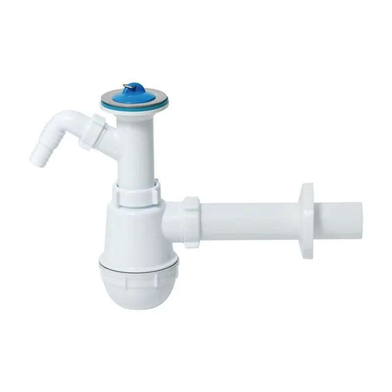 Funkcjonalny syfon zlewozmywakowy butelkowy pojedynczy – wyposażony w metalowe sitko 70 mm oraz wyjście do pralki lub zmywarki. Uniwersalna konstrukcja pasuje do większości zlewozmywaków, konstrukcja butelkowa efektywnie zabezpiecza przed zapachami kanalizacyjnymi. Wysokiej jakości materiały zapewniają szczelność i wytrzymałość, a prosty montaż sprawia, że instalacja jest szybka i bezproblemowa. Idealne rozwiązanie dla kuchni domowej.