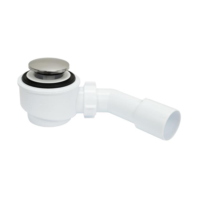 Syfon brodzikowy z otworem montażowym fi 50 mm, wyposażony w korek typu klik-klak oraz możliwość czyszczenia od góry — idealny do kabin prysznicowych z niskim brodzikiem. Korpus wykonany z polipropylenu, wykończenie w chromie. Regulowana długość rury odpływowej od 265 do 455 mm, z redukcją do 40/50 mm. Wysokość konstrukcji wynosi około 53 mm, przepływ około 24 l/min.