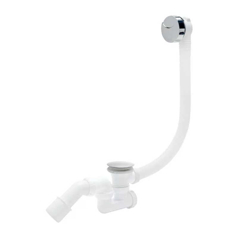 Automatyczny syfon wannowy chromowany STANDARD marki Wirquin – z regulowanym odpływem 1 1/2" × 40/50 mm, pokrętłem i dużym korkiem z chromowanego ABS oraz stalową linką w pancerzu długości 700 mm. Oferuje samocentrującą uszczelkę odpływu i średnicę odpływu 40 mm. Idealny do wanien i brodzików — trwały, łatwy w montażu i utrzymaniu czystości.
