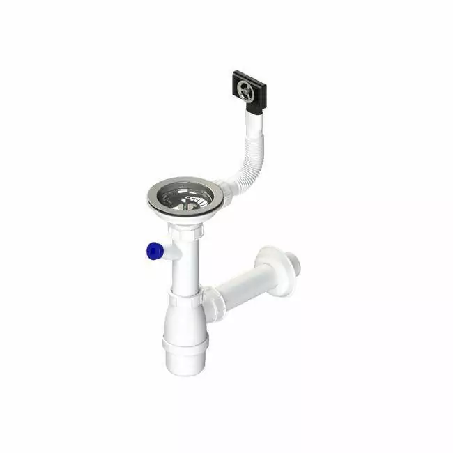Syfon butelkowy do zlewu 90 mm, 1-komora, z metalowym sitkiem i wyjściem bocznym — idealny dla zlewozmywaków z średnicą odpływu 90 mm. Posiada wyjście „P”, umożliwiające podłączenie węża pralki lub zmywarki. Wykonany z polipropylenu, z odpływem 40 mm, wyposażony w maskującą rozetę oraz przelew prostokątny i okrągły — solidna instalacja dla kuchni.