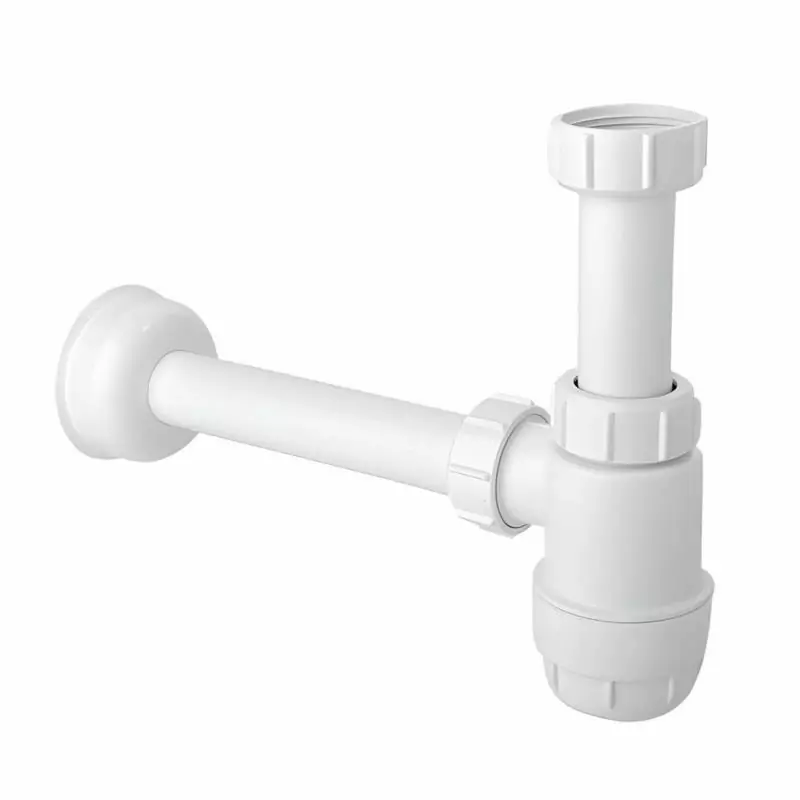 Kompaktowy syfon butelkowy niski HC1L 32 mm marki McAlpine — biały kolor, model bez spustu, przyłącze 1 1/4" × 32 mm. Wykonany z polipropylenu, z sitkiem ze stali nierdzewnej oraz gumowym korkiem. Przepustowość wynosi 39 l/min przy słupie wody 120 mm. Idealny do umywalek w ciasnych przestrzeniach dzięki niskiemu profilowi — trwały, łatwy w montażu i utrzymaniu czystości.