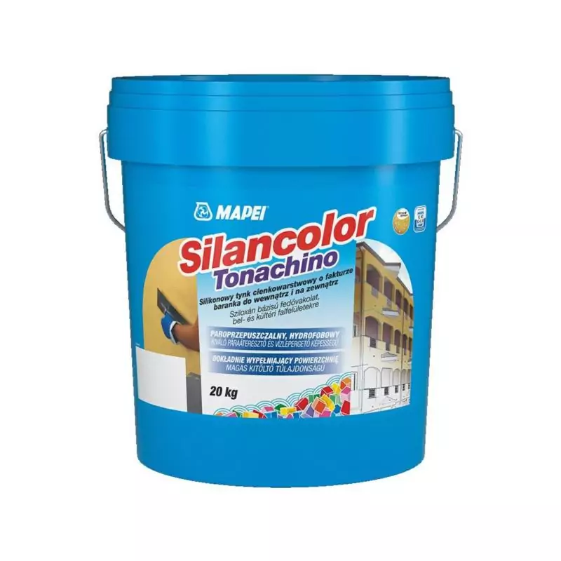 Tynk silikonowy Mapei Silancolor Tonachino 1,5 mm to zaawansowany produkt dekoracyjny do stosowania na zewnątrz i wewnątrz budynków. Dzięki wysokiej przepuszczalności pary wodnej i doskonałej wodoodporności, idealnie chroni fasady i systemy ociepleń. Aplikacja odbywa się przez natryskiwanie mechaniczne lub pacą. Produkt cechuje się trwałością kolorów, odpornością na zanieczyszczenia i mikroorganizmy.