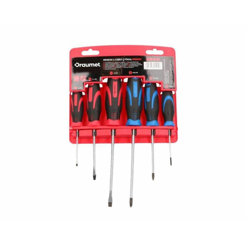 Wkrętaki z półką a-6 5949 to profesjonalny komplet narzędzi ręcznych, stanowiący podstawowe wyposażenie każdego warsztatu i skrzynki narzędziowej. Dołączona do zestawu funkcjonalna półka-organizer gwarantuje doskonałą organizację śrubokrętów oraz szybki i łatwy dostęp do każdego z nich.