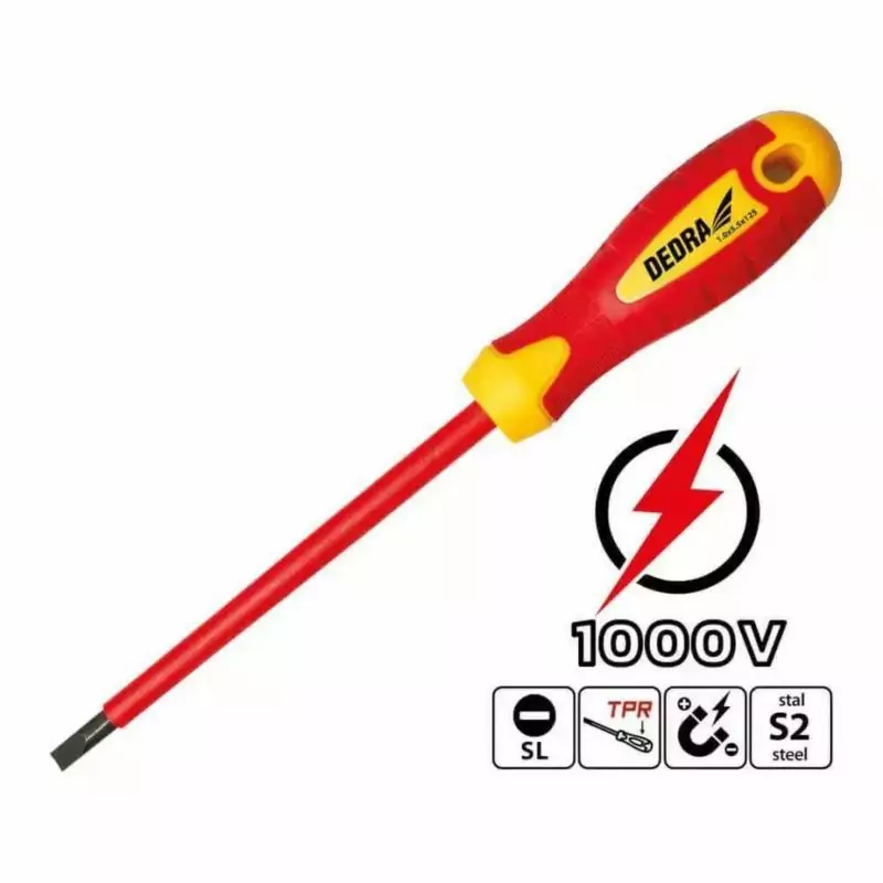 Wkrętak izolowany płaski 2.5x75mm Dedra 06B001 to profesjonalne narzędzie ręczne, niezbędne podczas wykonywania precyzyjnych prac elektrycznych. Dzięki certyfikowanej izolacji do 1000V oraz grotowi wykonanemu z wytrzymałej stali S2, gwarantuje maksymalne bezpieczeństwo i trwałość podczas pracy pod napięciem.