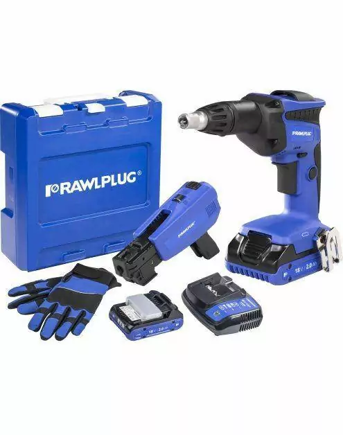 18 V RawlDRIVER Wkrętarka do płyt g-k, 2 akumulatory 2,0 Ah ładowarka 1,5 A podajnik do wkrętów walizka RawlCASE - walizka plast