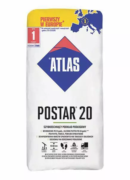 ATLAS POSTAR 20 to wysokiej jakości, szybkoschnący podkład cementowy dostępny w opakowaniach 25 kg, zaprojektowany do aplikacji w grubościach od 10 do 80 mm. Wytwarzany na bazie cementu portlandzkiego, wypełniaczy kwarcowych oraz dodatków modyfikujących, zapewnia doskonałą przyczepność i trwałość. Idealny do uzyskiwania równych powierzchni zarówno poziomych, jak i ze spadkiem.