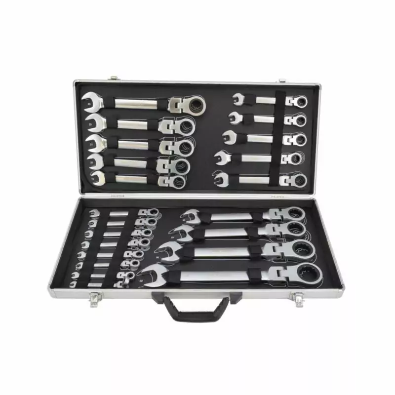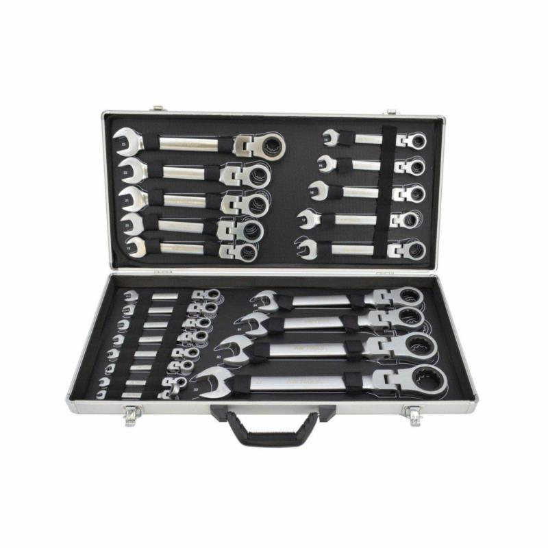 Klucze w zestawie charakteryzują się satynowym wykończeniem, które nie tylko poprawia estetykę, ale również chroni przed korozją i ułatwia utrzymanie narzędzi w czystości. Każdy klucz wyposażony jest w precyzyjny mechanizm zapadkowy – grzechotkę z 72 zębami, która zapewnia minimalny skok roboczy wynoszący zaledwie 5°. To kluczowa cecha pozwalająca na precyzyjne operowanie śrubami w miejscach o ograniczonym zakresie ruchu. Dodatkowo, główka przegubowa znacząco zwiększa funkcjonalność, umożliwiając pracę pod różnymi kątami i ułatwiając dostęp do śrub w trudno dostępnych miejscach, co czyni go idealnym zestawem kluczy do ciasnych przestrzeni.