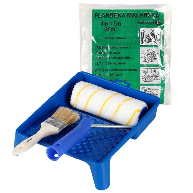 Gotowy zestaw malarski zawierający folię malarską 4m x 5m, pędzel angielski 5cm, wałek 18cm oraz dostosowaną kuwetę 24x26cm.