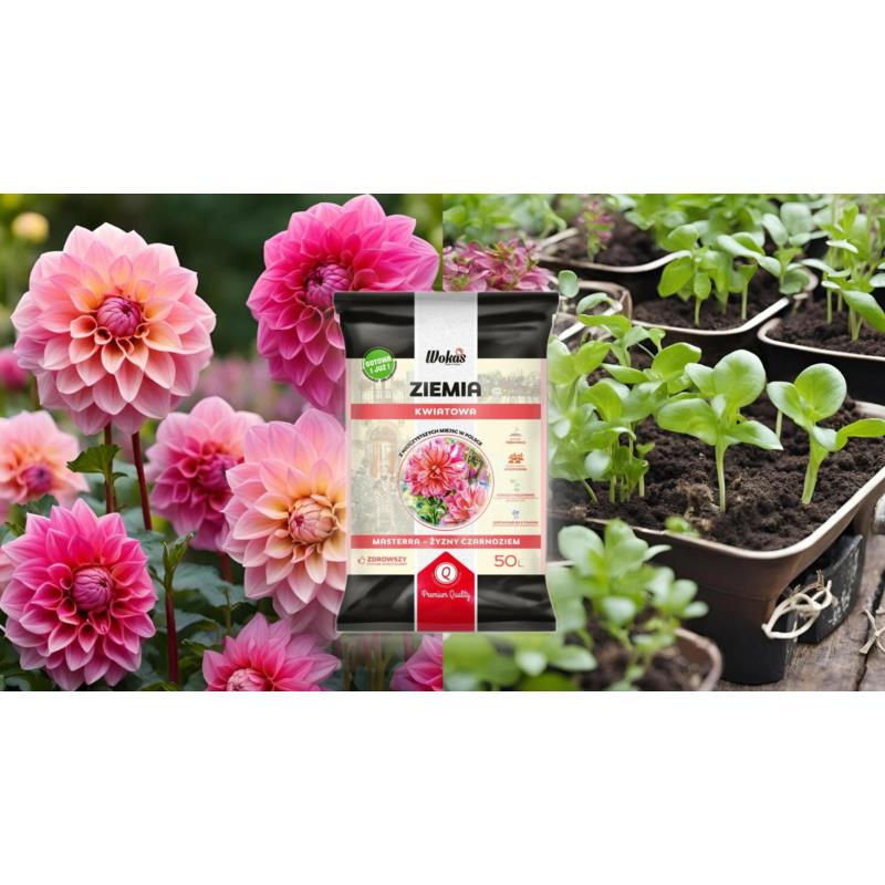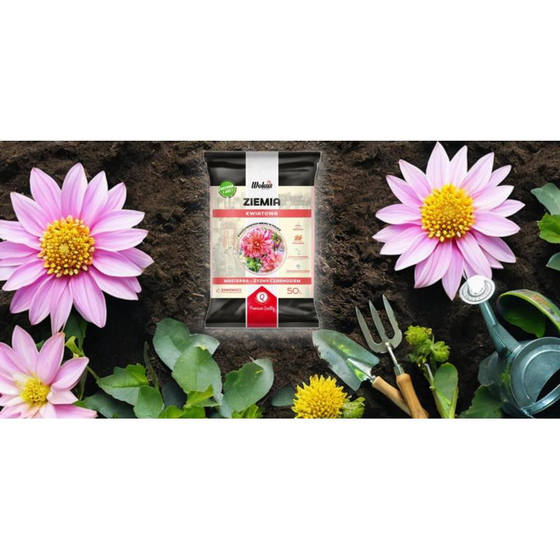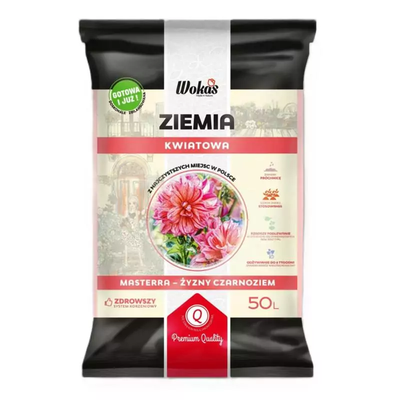Ziemia kwiatowa Masterra 50L marki Wokas to idealny wybór dla miłośników roślin. Żyzny czarnoziem z wysoką zawartością torfu doskonale utrzymuje wilgoć, co ułatwia pielęgnację. Mieszanka torfu, piasku i nawozu wieloskładnikowego zapewnia optymalne warunki do wzrostu i obfitego kwitnienia kwiatów w domu, ogrodzie, na balkonie i tarasie. pH w granicach 5,5 - 6,5 sprzyja zdrowemu rozwojowi roślin.