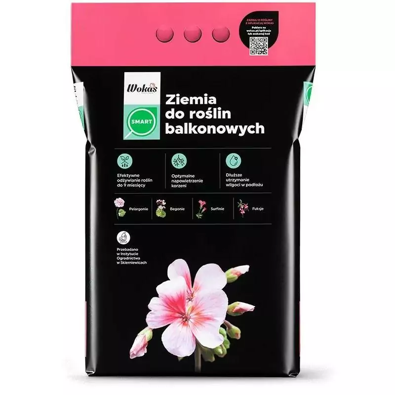 Ziemia do roślin balkonowych Wokas Smart 20L to idealne podłoże dla pelargonii, surfinii, begonii i innych roślin. Zawiera naturalne składniki, takie jak torf, perlit i kora kompostowana, zapewniając optymalne napowietrzenie i dłuższe utrzymywanie wilgoci. Wzbogacona nawozem długodziałającym, wspiera wzrost roślin przez 9 miesięcy, minimalizując potrzebę nawożenia. PH 5,5-6,8, idealna do doniczek i skrzynek balkonowych.