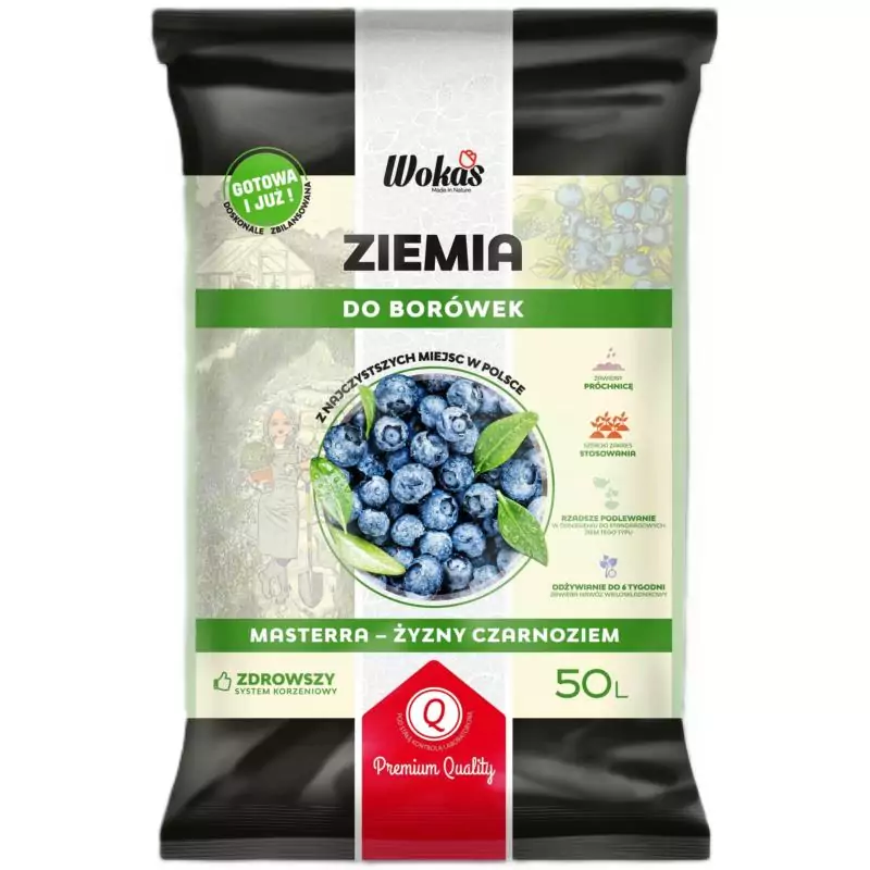 Ziemia do borówek Wokas Masterra 50L to specjalistyczna mieszanka, stworzona z myślą o wymagających roślinach, takich jak borówki amerykańskie, brusznica i żurawina. Zapewnia odpowiednią kwasowość gleby (pH 3,5-4,5), co jest kluczowe dla ich zdrowego wzrostu. Produkt ten jest gotowy do użycia zaraz po zakupie, co czyni go idealnym rozwiązaniem dla ogrodników poszukujących wygodnych i skutecznych metod uprawy.