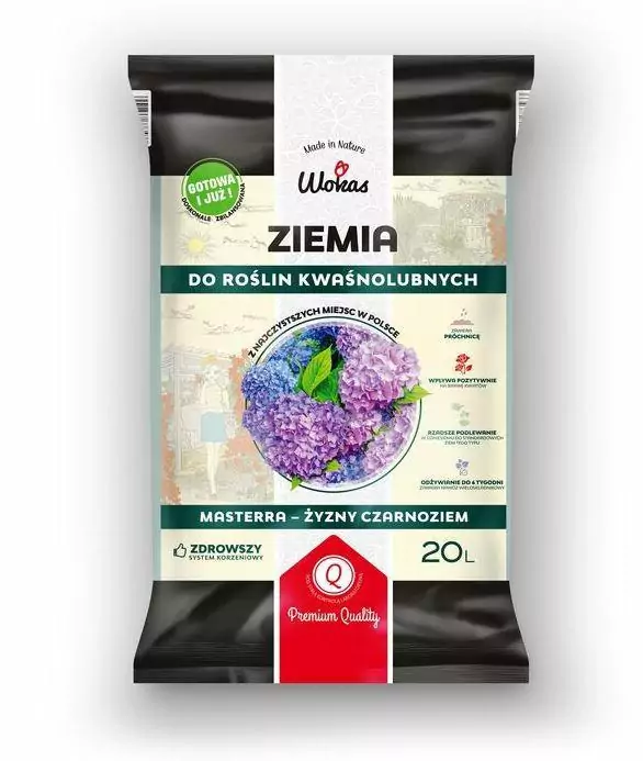 Ziemia do roślin kwaśnolubnych Wokas Masterra 20L to idealna kompozycja torfów, kory sosnowej i nawozu wieloskładnikowego, zapewniająca optymalne pH 4,0 - 5,5. Skutecznie wspiera wzrost hortensji, wrzosów, azalii i borówek, dzięki czemu rośliny intensyfikują swoje wybarwienie. Oferuje doskonałą przepuszczalność, co sprzyja zdrowemu rozwojowi roślin. Wybierz Wokas Masterra dla pięknych i zdrowych roślin kwaśnolubnych!